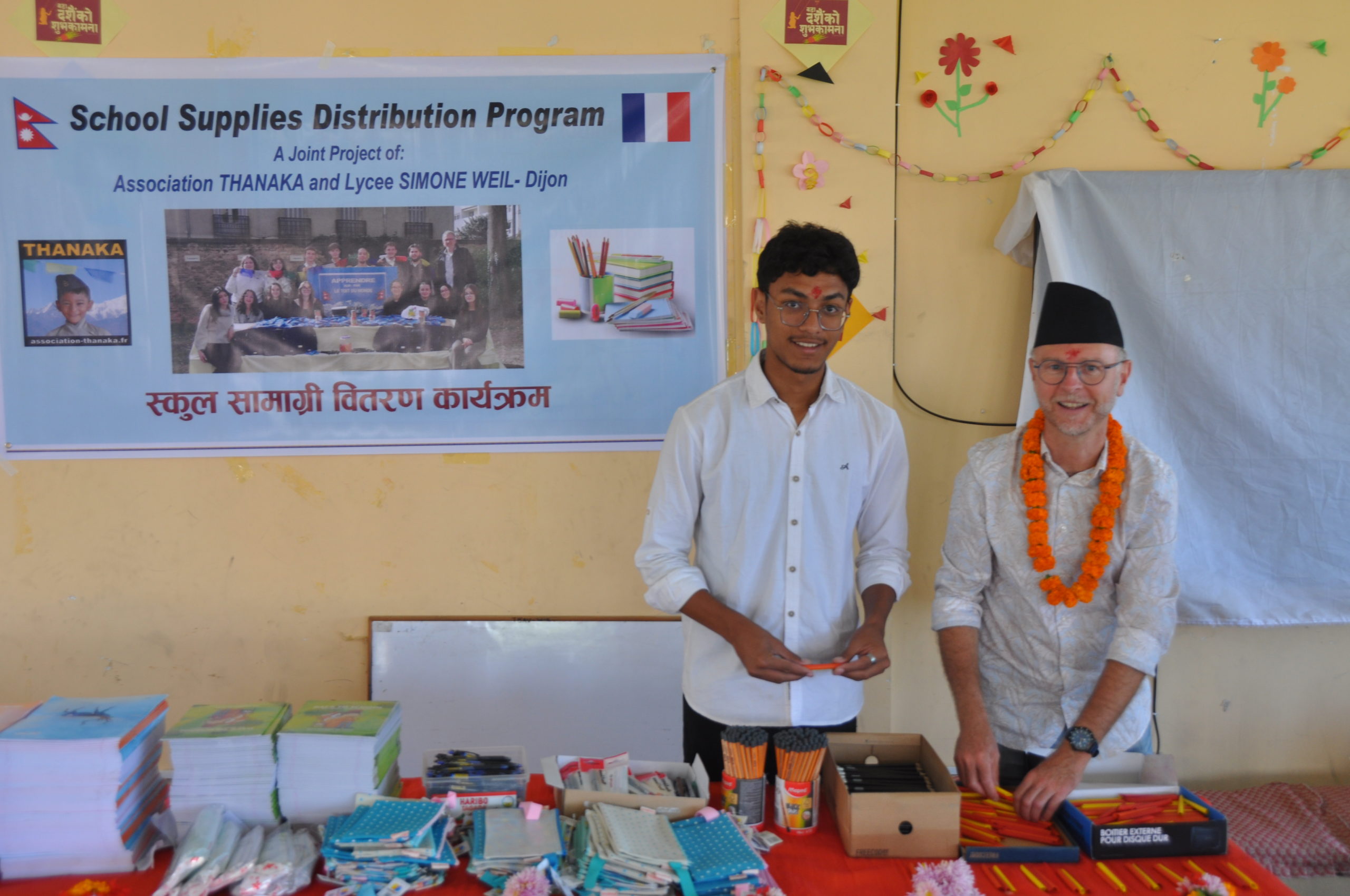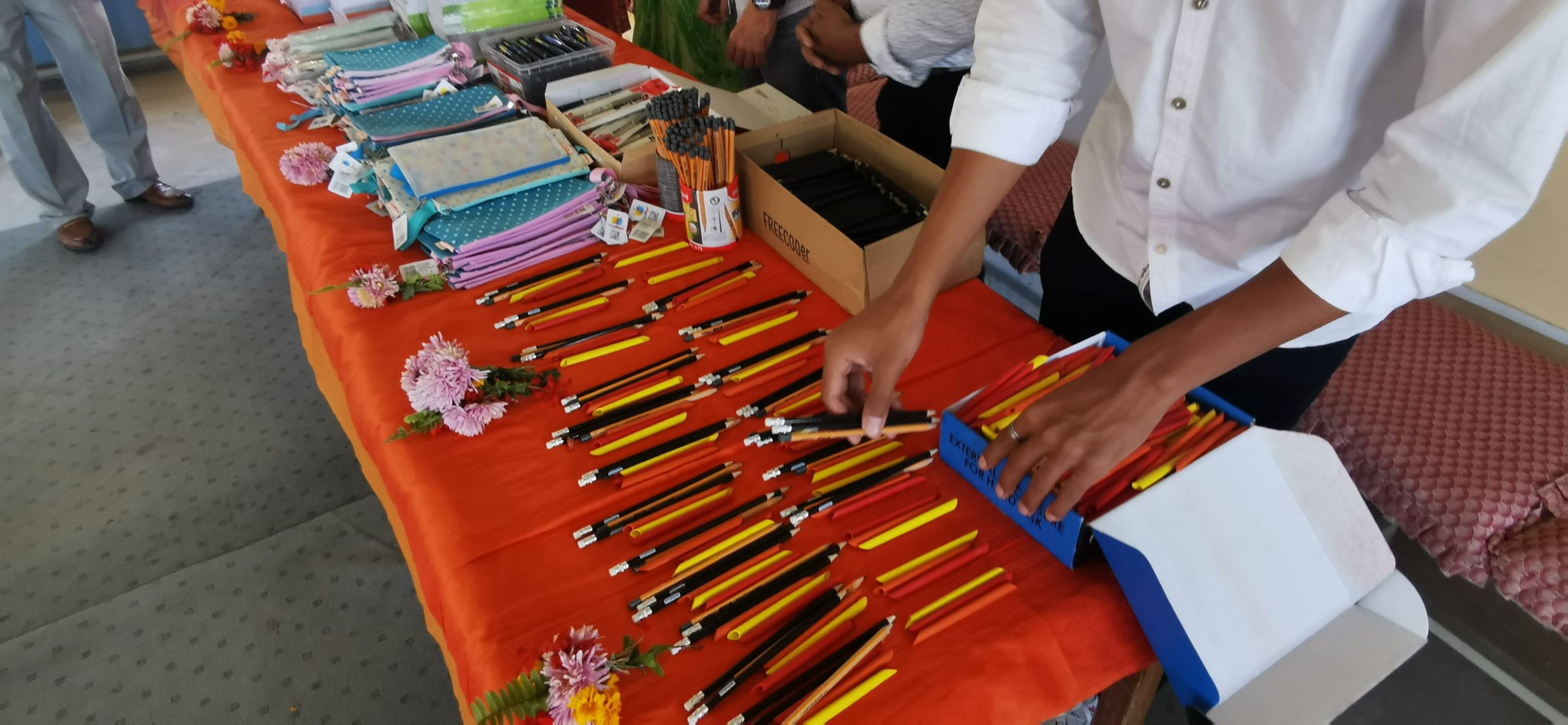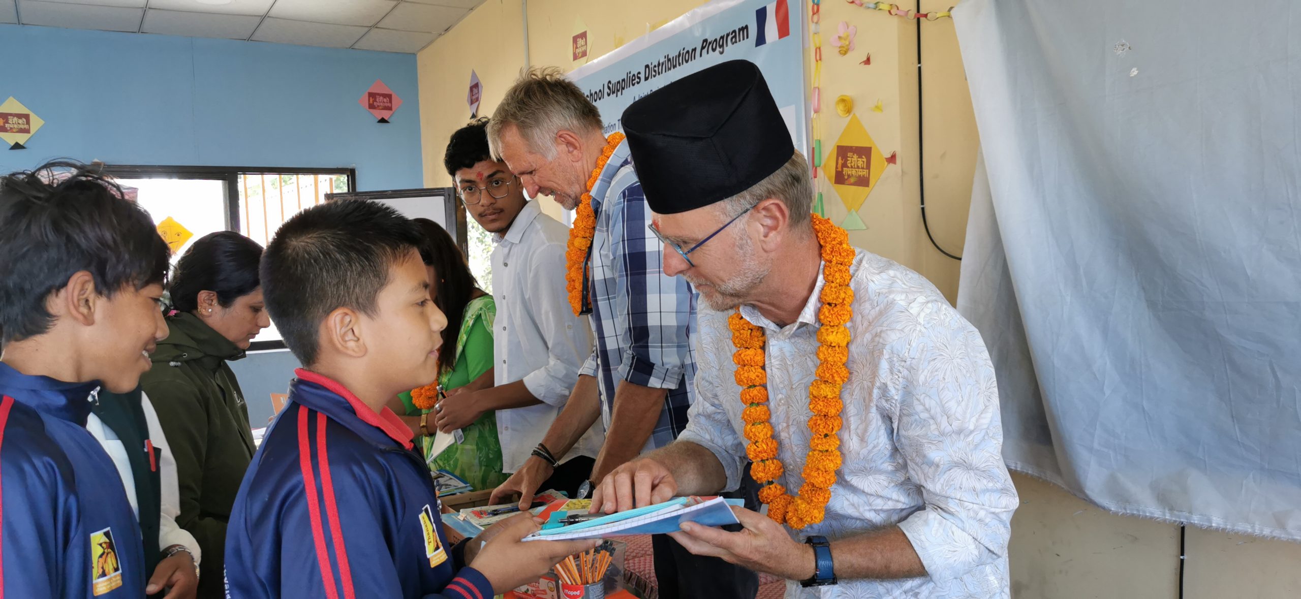 Ce vendredi matin, colliers de fleurs et tikka nous attendaient pour nous souhaiter la bienvenue. C’est ensuite, dans une atmosphère ambiancée que discours de bienvenue et autres marques d’attention étaient prononcées sous les applaudissements d’une centaine d’élèves. Quelle ne fut pas notre émotion de les voir nous remercier à travers des chants et des danses. C’est les yeux mouillés que chez chacun d’entre nous leur a remis trousse, crayons, stylos, cahiers …