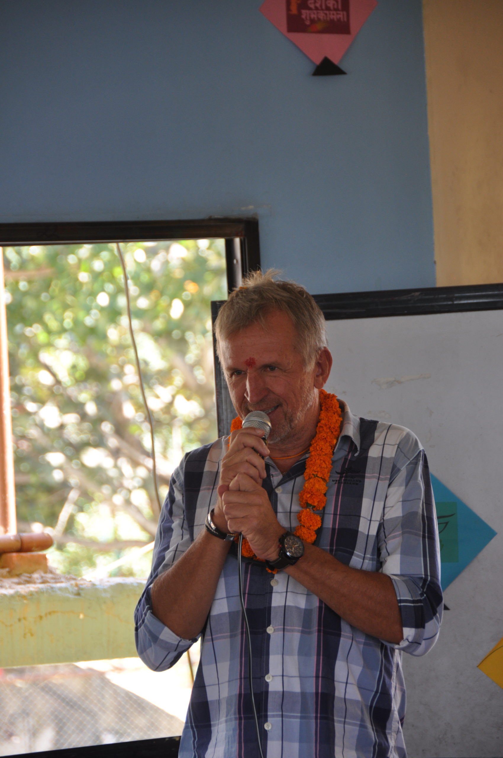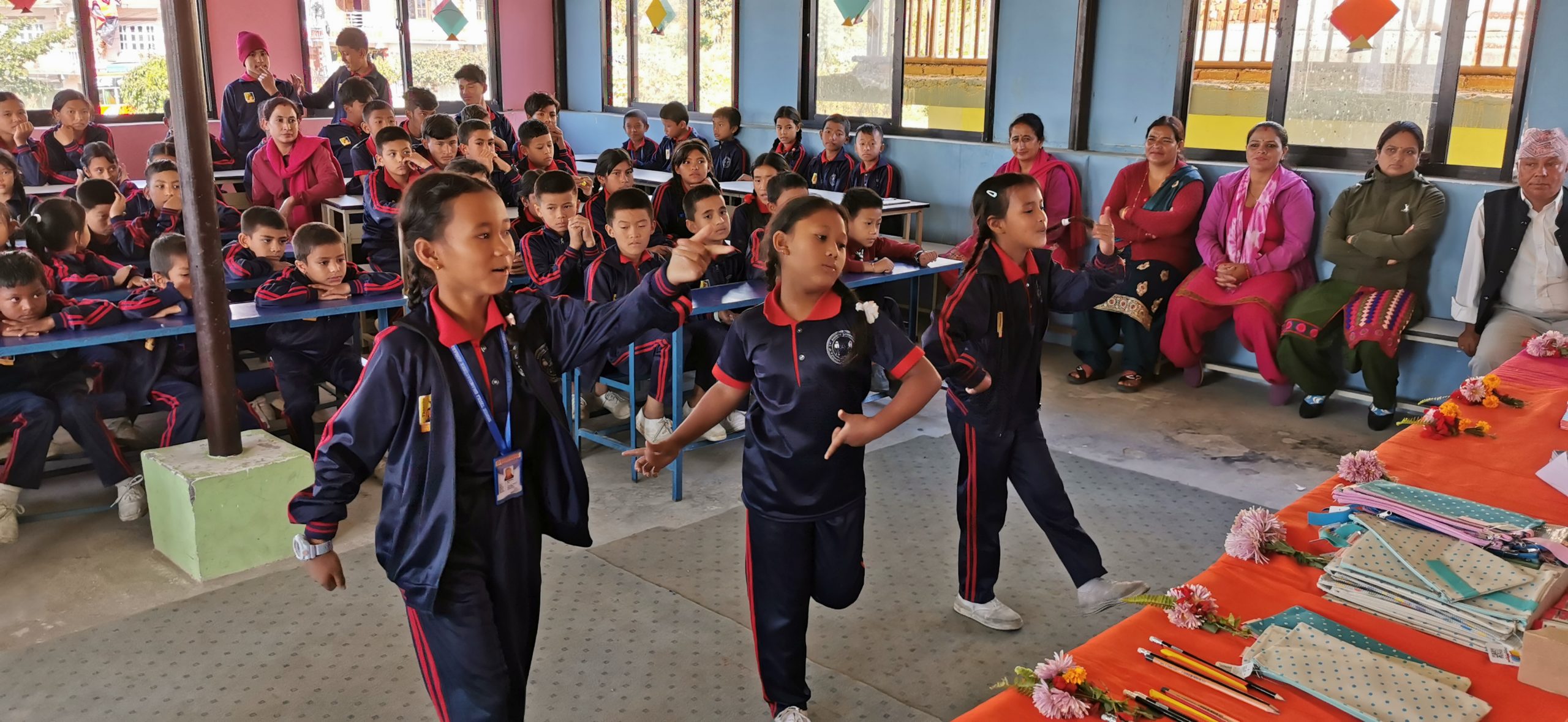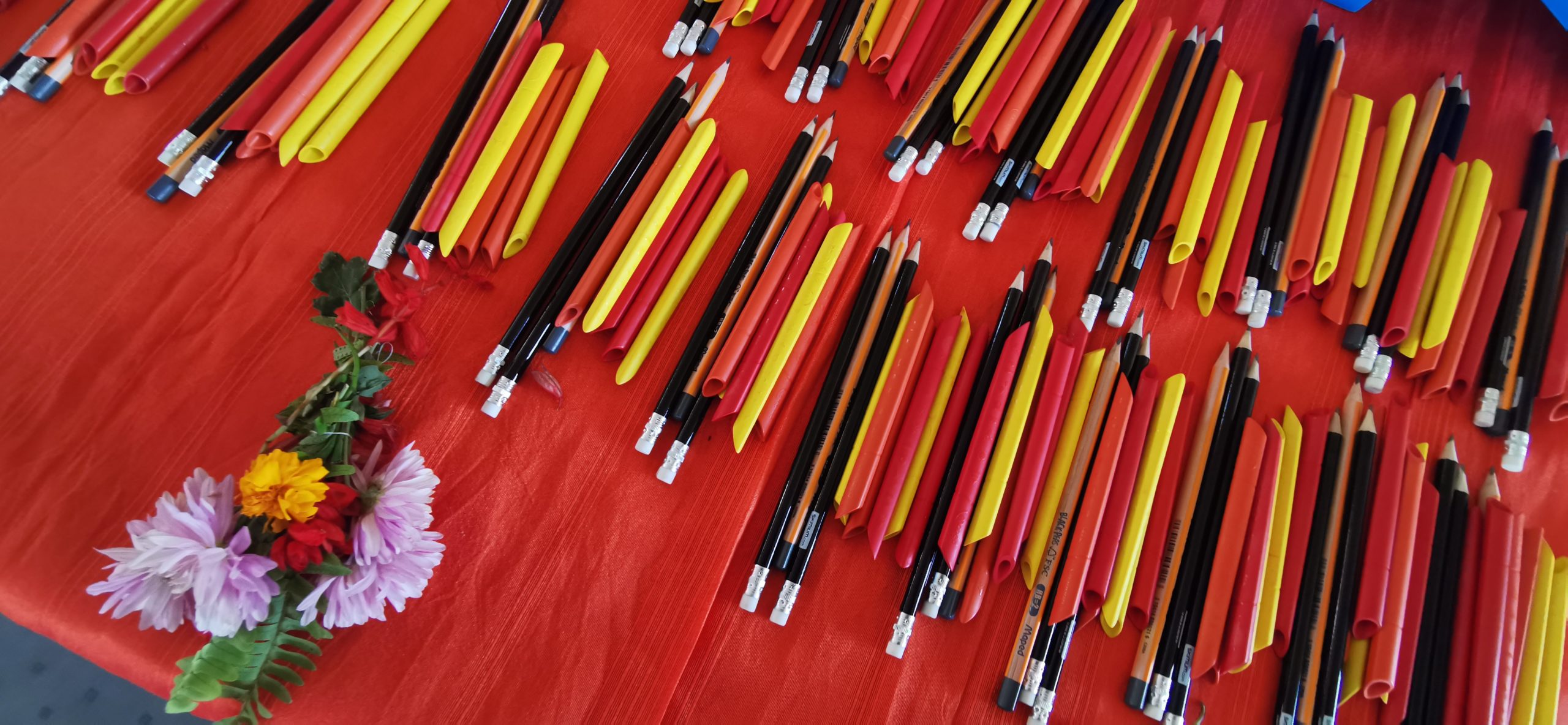 Ce vendredi matin, colliers de fleurs et tikka nous attendaient pour nous souhaiter la bienvenue. C’est ensuite, dans une atmosphère ambiancée que discours de bienvenue et autres marques d’attention étaient prononcées sous les applaudissements d’une centaine d’élèves. Quelle ne fut pas notre émotion de les voir nous remercier à travers des chants et des danses. C’est les yeux mouillés que chez chacun d’entre nous leur a remis trousse, crayons, stylos, cahiers …