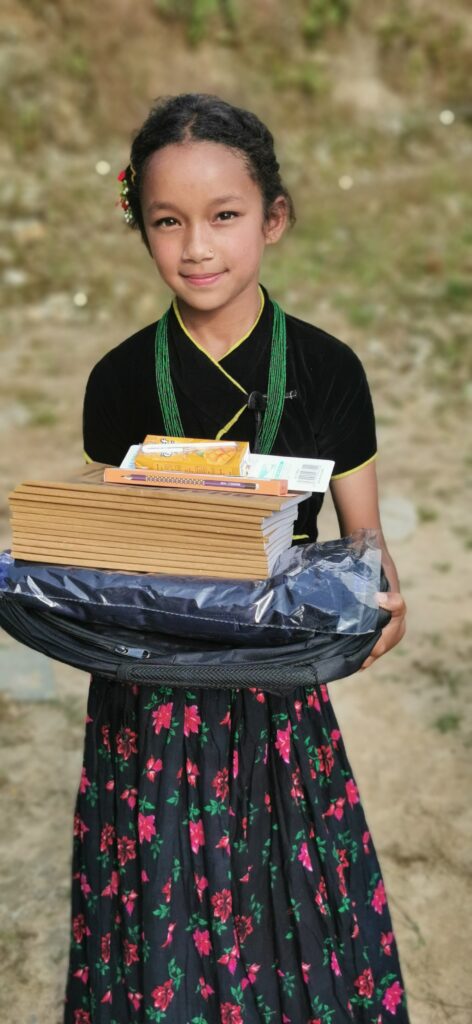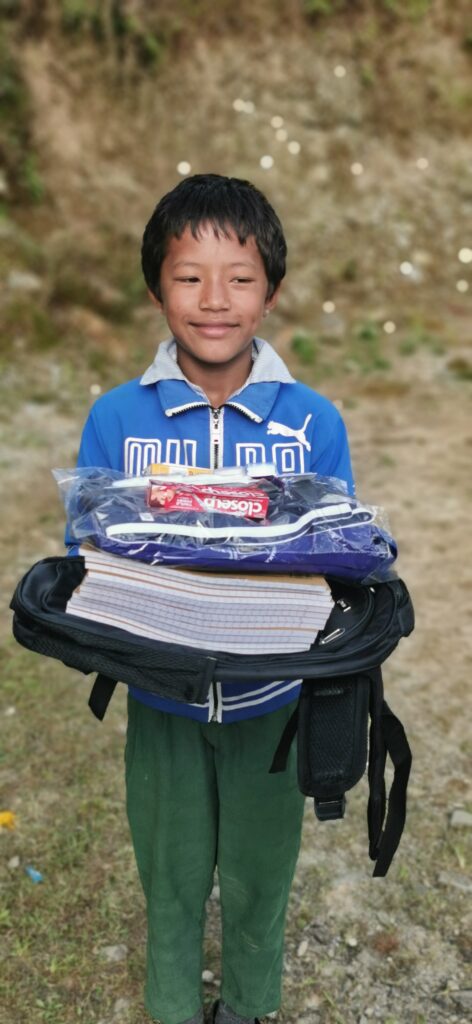 Très vite arrivent les longs discours. Chacun veut nous remercier de notre venue et nous féliciter de cette coopération. Pendant ce temps, les enfants attendent très sagement au soleil. L’après-midi est ponctuée de chants et de danses. Puis vient le moment encore plus magique où chaque enfant reçoit un uniforme, un cartable, douze cahiers, des petites fournitures scolaires, une brosse à dent, un jus de fruit. Les adultes sont également valorisés par un cadeau. Prithivi et Surya ont une fois de plus organisés la logistique de main de maitre.